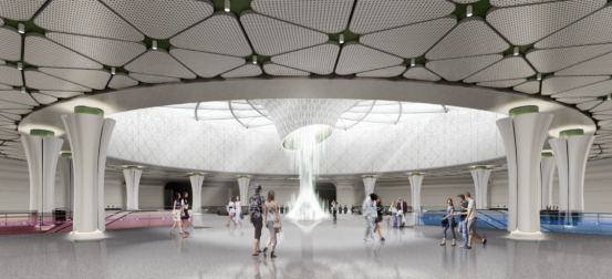 中央商务区站位于济南市历下区中央商务区的绸带公园内,是6号线号线的重要换乘节点,取意“汇聚”——产业、交通与人文在此交融。设计提炼泉、荷、柳等泉城元素,以现代手法重构,营造出“城景交融”的公共空间效果,既延续地域文化,也成为城市形象的现代窗口。