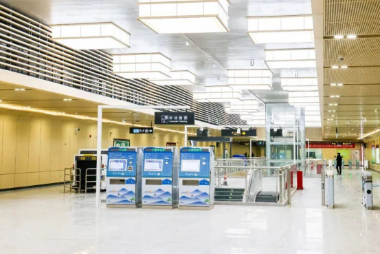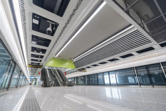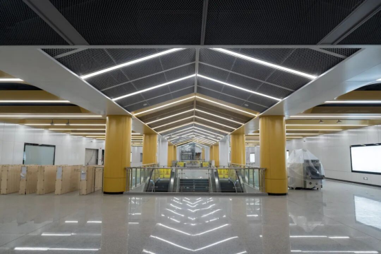 段店站以“段店大集”的商贸文脉为灵感原点,通过现代设计语言诠释传统市集的空间韵律——大跨无柱站厅顶部采用模块化金属格栅,模拟传统集市棚顶的肌理变化,嵌入式线性灯光如货摊灯带般纵向延伸,营造“万家灯火”的商业氛围。