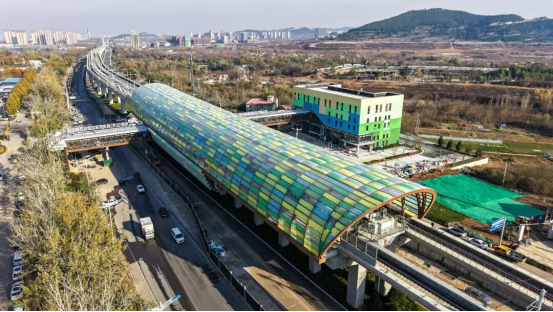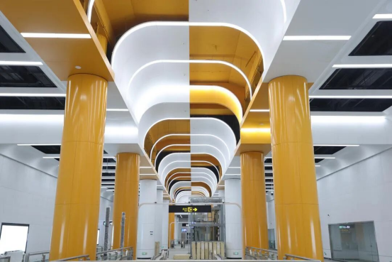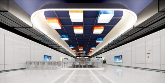 汉峪金谷站位于经十路与凤凰路交叉口西南侧,沿经十路呈“一字型”布置。此站立足商务区属性,通过模块化构件与渐变色彩的运用,艺术化表达“金谷腾飞”的意象,既呼应区域金融中心的现代气质,也隐喻地铁带来的发展机遇,让乘客在穿行中感受到城市进阶的脉搏。