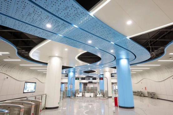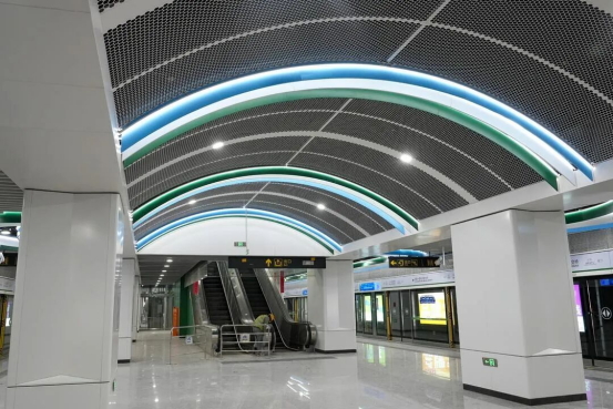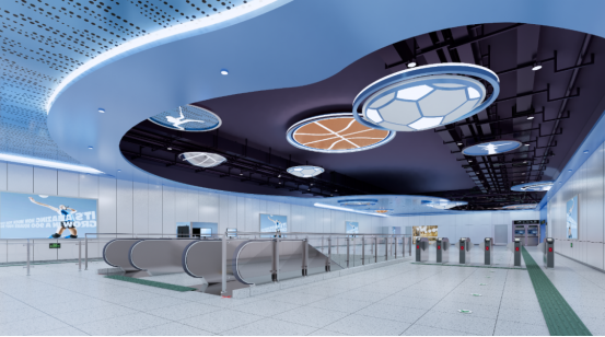 省体育中心站的装修设计以全民健身运动为灵感源泉,以“运动场”为空间原型,将体育精神凝练为动态设计语言——足球、篮球、排球造型元素构成“悬浮赛场”,配合流线型灯带模拟运动轨迹,营造穹顶之下的竞技张力,天花铝板通过渐变穿孔形成“观众看台”,打造可感知的体育文化长廊,为乘客带来充满活力与动感的体验。