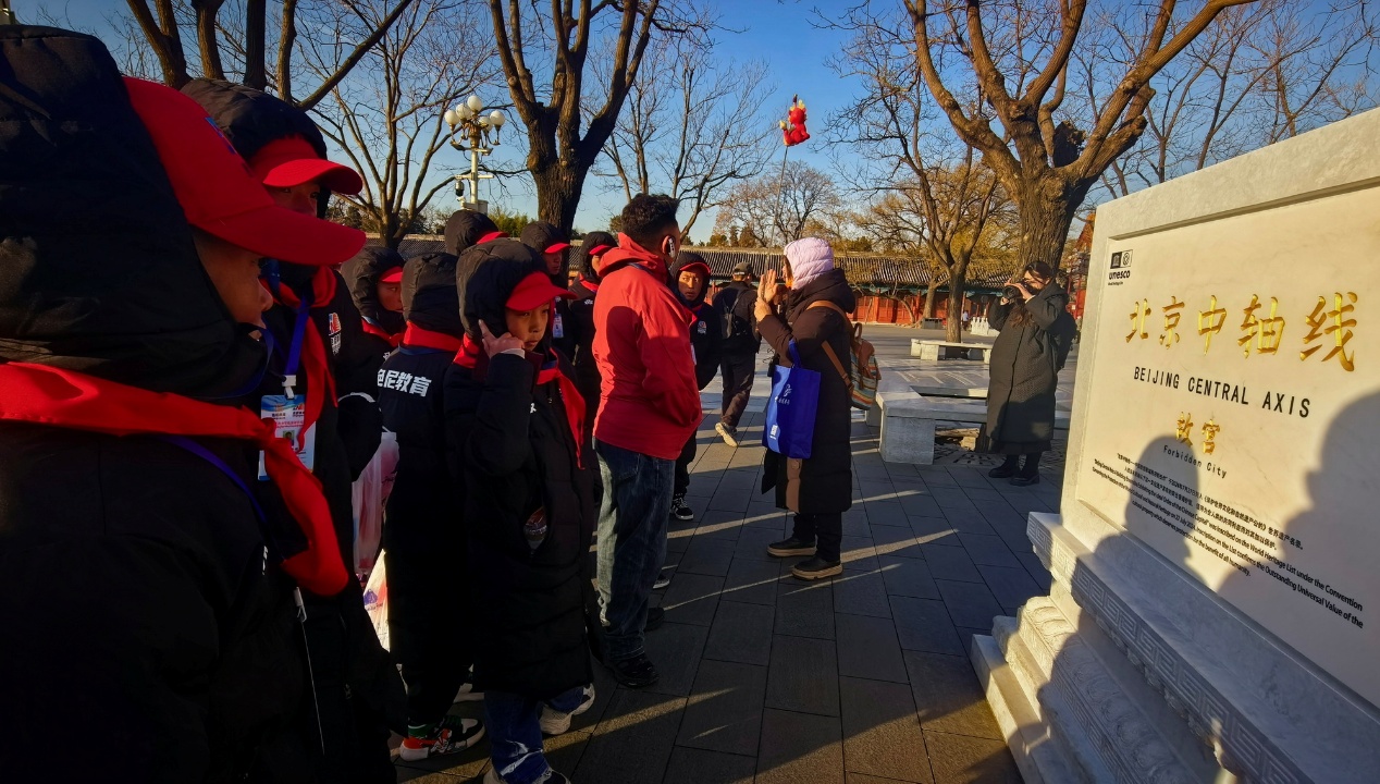 图为西藏自治区那曲市色尼区青少年足球队赴京研学团一行在了解被列入《世界遗产名录》的北京中轴线 摄影:刘莉