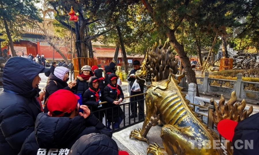 图为西藏自治区那曲市色尼区青少年足球队赴京研学团的孩子们在了解故宫里的塑像 摄影:刘莉