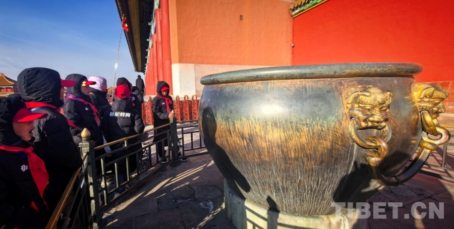 图为西藏自治区那曲市色尼区青少年足球队赴京研学团的孩子们在了解故宫里以大铜缸为代表的消防设施 摄影:刘莉