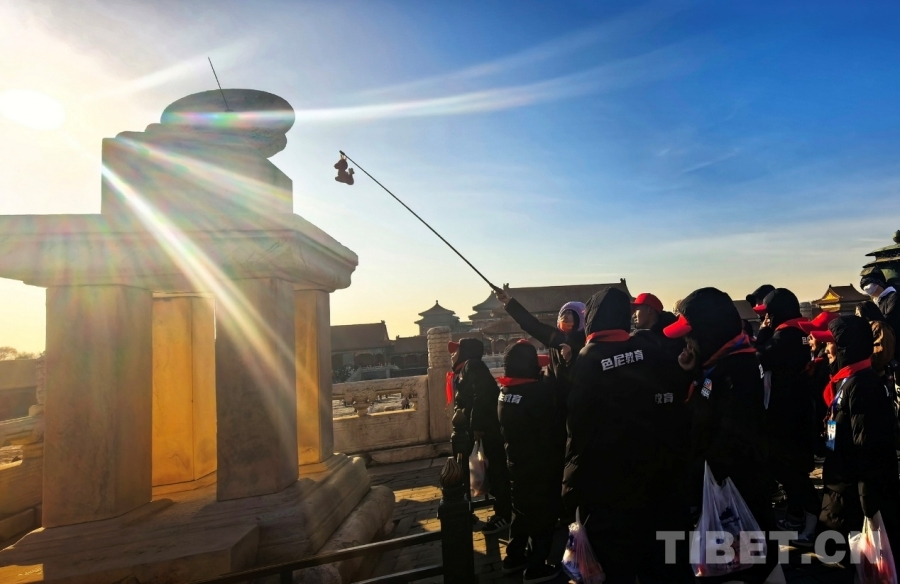 图为西藏自治区那曲市色尼区青少年足球队赴京研学团的孩子们在了解故宫里的日晷 摄影:刘莉