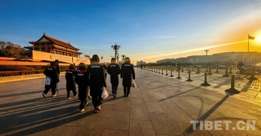 图为西藏自治区那曲市色尼区青少年足球队赴京研学团一行迎着朝阳走在北京长安街上 摄影:刘莉