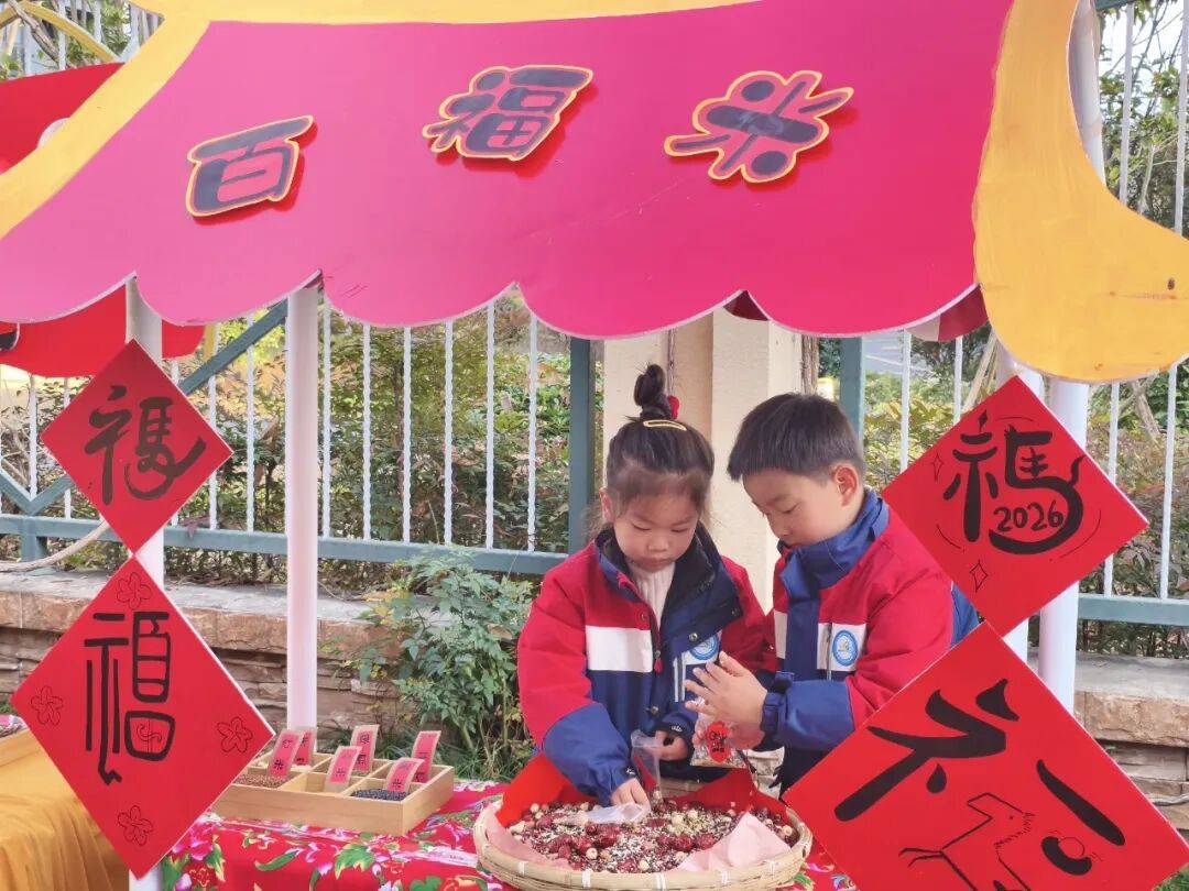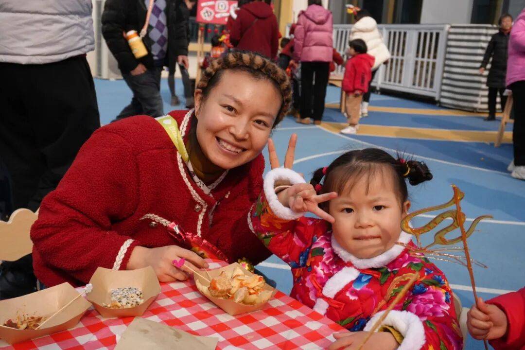 △春蕾幼儿园春江景苑园区“景乐汇”迎新年市集热闹开启:萌娃们身着传统服饰,或巧手做红绳装饰,或参与趣味捞零食,现场还有美味甜品供应,在欢乐互动中迎新年。