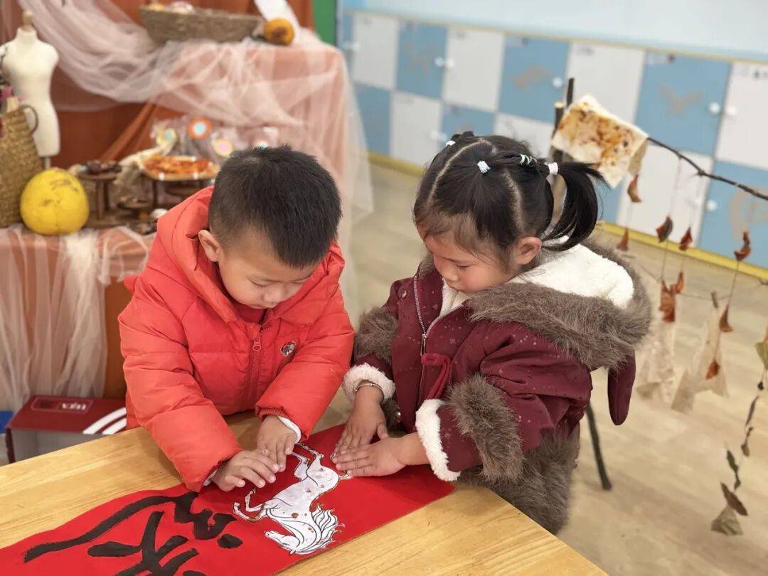 △科技城未来幼儿园的孩子们在火红的对联上拓出金色小马。一笔一印,专注认真,将童真童趣与新年祝福定格在传统红纸间。
